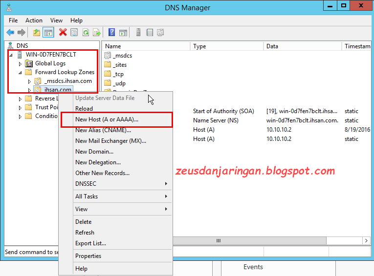 - Menuju Forward Lookup Zones > ihsan.com. Lalu klik kanan pada "ihsan.com" lalu klik "New Host (A or AAA..)